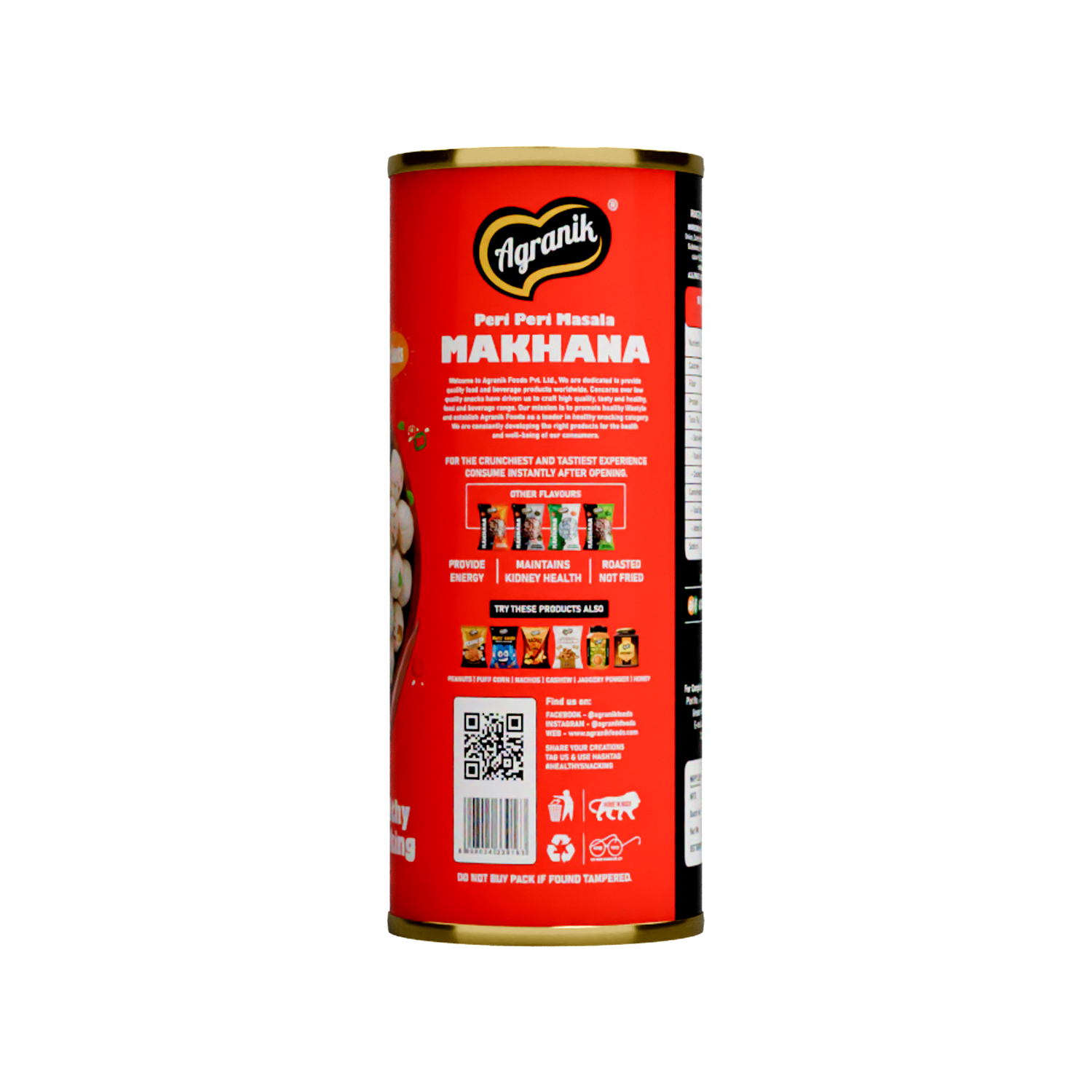 Agranik’s range of Peri Peri Masala Makhana are tasty and healthy, non-fried and tossed into the Himalayan salt. Peri Peri Masala Makhanas will fulfil your daily protein requirement whilst providing you the perfect blend of flavours.